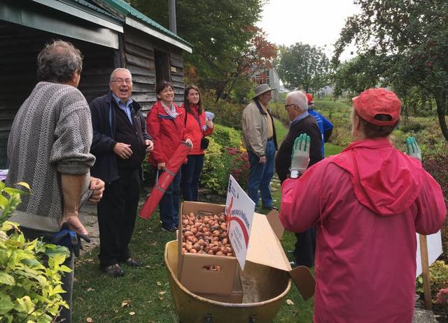 Samedi le  7 octobre en compagnie de M. Raymond Bernier, député de montmorency et donateur de 1000 bulbes de tulipes Île de France pour souligner les 25 ans des jardins,  des jardiniers se sont rassemblés afin de planter des bulbes qui fleuriront de nombreuses années! Nous avons eu le plaisir de recevoir des représentants de la Société Parkinson de Québec et le privilège de recevoir le Jardinier paresseux, M. Larry Hodgson qui nous a fait part de quelques conseils horticoles. Merci à tous!