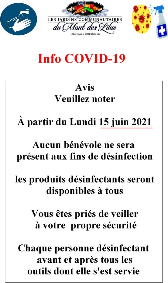 Cependant, à partir de lundi 15 juin, tout revient à la normale. Vous aurez accès libre aux cabanons (ne pas oublier de refermer la porte à chaque fois) sauf que ce sera la responsabilité de chacun et chacune de faire la désinfection des outils et/ou arrosoirs après utilisation. Les produits désinfectants seront mis à votre disposition à cet effet dans les cabanons.